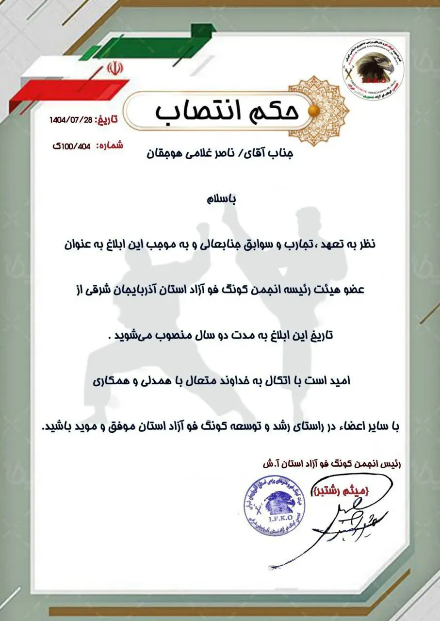 با حکم میثم رشتبر، رئیس انجمن کونگ فو آزاد استان آذربایجان شرقی، ناصر غلامی هوجقان به این سمت منصوب گردید. این حکم در نشستی با حضور برخی از اعضای این انجمن اهدا شد.